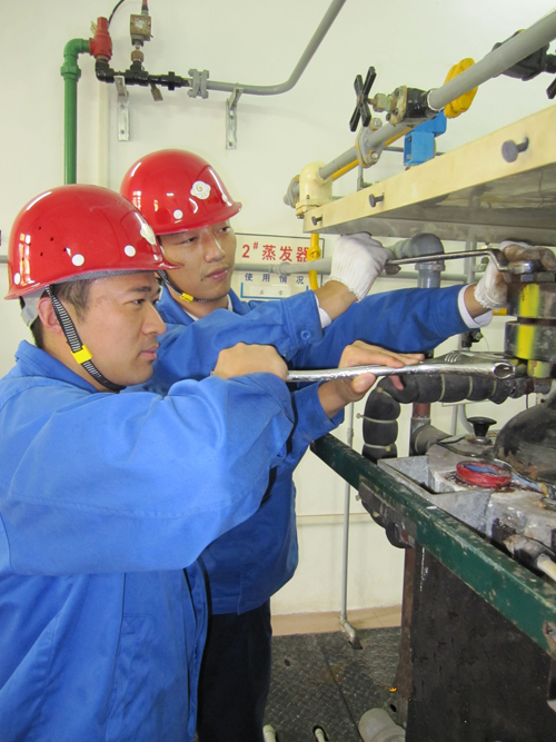 作為重大危險源危險設備整體檢修保養工作的一部分,該水廠在去年底就對蒸發器的保養制定了詳細的計劃,一方面通過設備部聯系設備供應商進行技術指導、組織備品備件,另一方面協調機電維修中心及早落實人員和檢修時間、謀劃好檢修時的生產調度工作。在檢修過程中,檢修人員按照相關步驟和要求,嚴謹有序展開維護保養,把蒸發器的各個部件及附屬管線一一拆卸,清洗、干燥蒸發筒內壁,清除加熱水箱積垢,疏通加氯管線和過濾器,更換陽極保護鎂棒,修理故障零部件……仔細排查,有效消除設備隱患。當天,各部門相互配合、緊密協作,從早上一直奮戰到晚上六點多鐘,圓滿完成了蒸發器的保養任務。