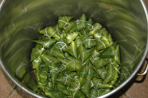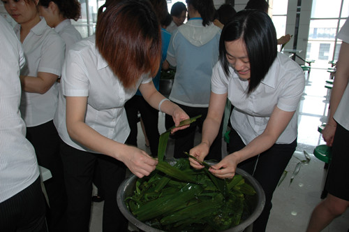 挑選3-4張?zhí)J葦葉交錯疊開,將葉子圍成圓錐狀,放進(jìn)大米花生,包蓋圓錐口,用手攥出棱角,再拿一張粽葉包裹住露出的口子,用繩子扎緊,一個粽子就完成了?戳藥状位菊莆詹襟E,大家也躍躍欲試,可實(shí)踐往往沒有想象的那么簡單,米裝得太松裹不緊,米裝得太多或者壓得太緊又容易把粽葉弄破,好不容易把粽葉包好了,最后封口又是一道難關(guān),捆綁時手稍微一松粽子就散開了!叭绻衲暝賹W(xué)不會又要等下次活動啦,這次一定要成功!”有些員工已不是第一次參加,或許她們包的并不好,但她們那股認(rèn)真、執(zhí)著的勁頭值得贊揚(yáng)。隨著大家的“埋頭苦干”,粽葉漸漸減少,桶里滿滿地堆起大家的“心意”。